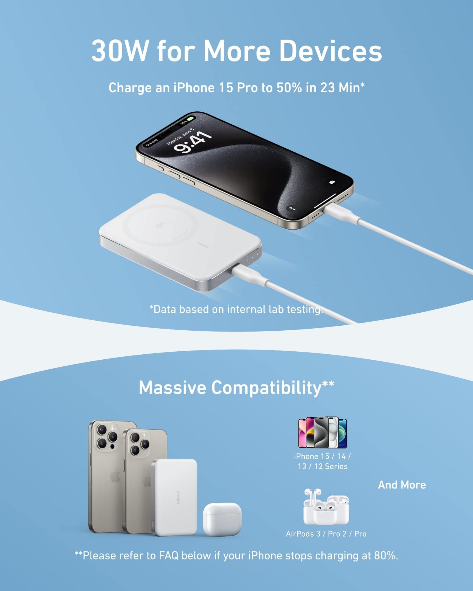 Giữ cho thiết bị của bạn được sạc đầy nhanh chóng với đầu ra không dây 15W đạt chứng nhận Qi2, sạc iPhone 15 Pro từ 0 đến 50% trong 51 phút . Nó cũng có cổng USB-C 30W để tương thích rộng rãi .